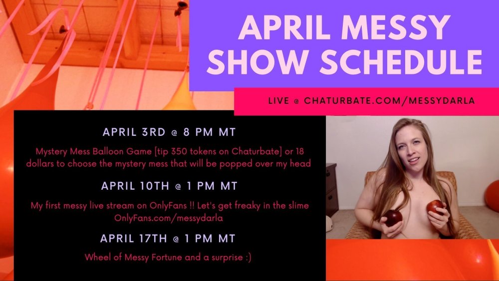 Hi all !! Messy Darla here. I'll be back on Chaturbate for a live messy show this Friday, April 3rd. I'll be online from 8 pm - 2 am MT and will be bringing back the Mystery Mess Balloon Game :)